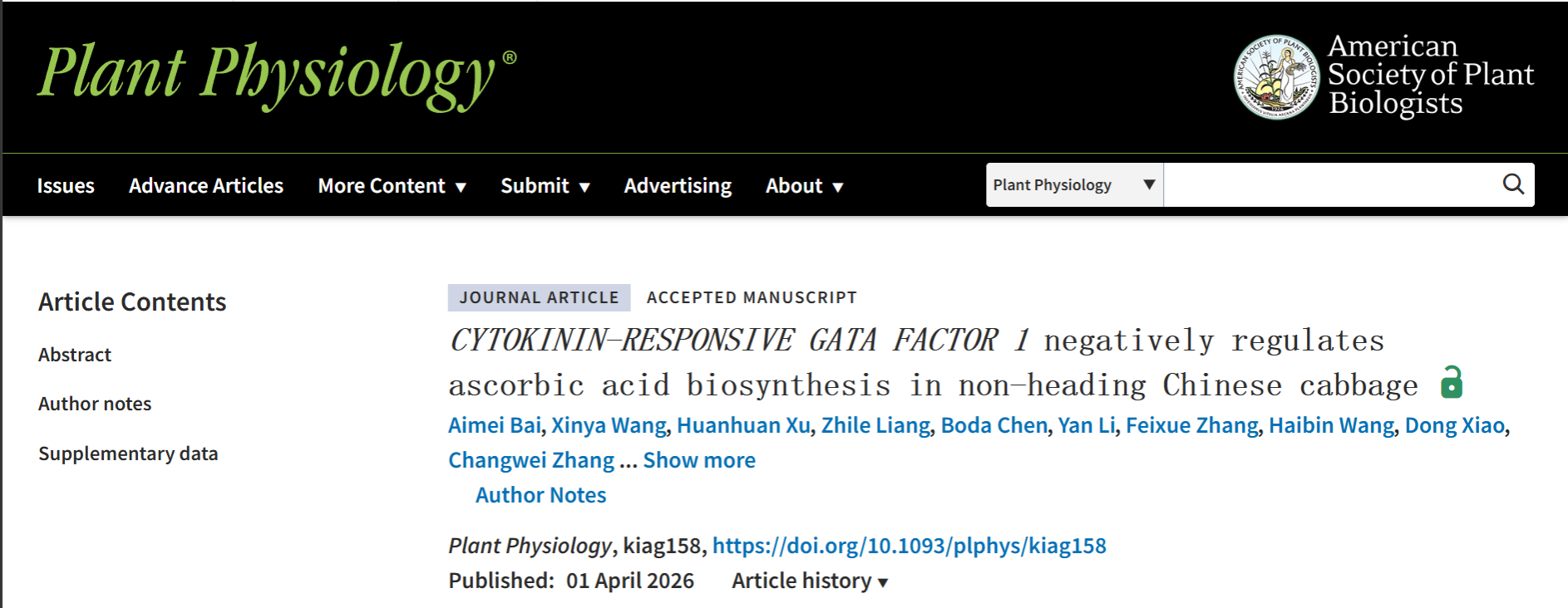 近日,南京农业大学园艺学院白菜系统生物学实验室在国际植物学期刊《Plant Physiology》在线发表题为“CYTOKININ-RESPONSIVE GATA FACTOR 1 negatively regulates ascorbic acid biosynthesis in non-heading Chinese cabbage”的研究论文,该研究锁定了调控AsA积累的关键GATA转录因子BcCGA1,揭示了BcCGA1通过直接抑制AsA合成关键基因转录负调控AsA积累的分子调控机制,为不结球白菜营养品质的分子改良奠定了遗传基础。